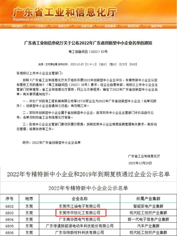 At the beginning of the new year, good news is coming! On January 6, the Department of Industry and Information Technology of Guangdong Province released the List of Specialized, Special and New Small and Medium-sized Enterprises in 2022 and Enterprises that Will Be Reviewed and Passed in 2019. Dongguan Zhongfang Chemical, a new material of general technology, was successfully selected into the list of "specialized, special and new" enterprises in Guangdong Province.