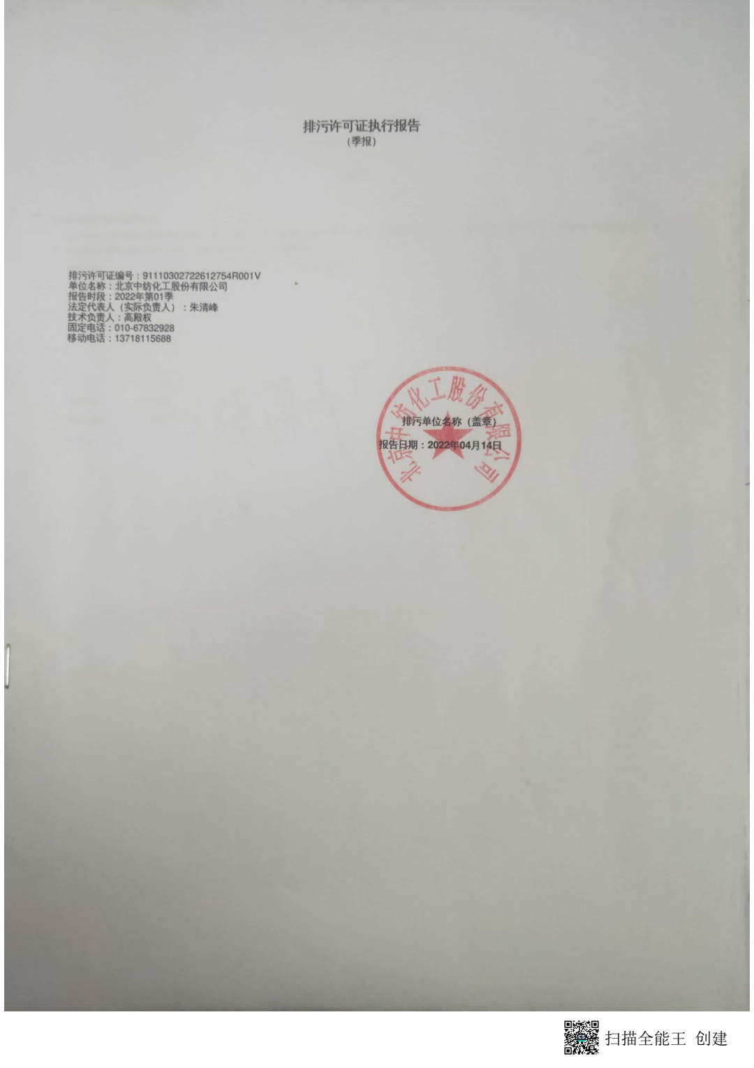 2022 - The first quarter of the implementation of the pollution permit of China Textile Chemical Industry